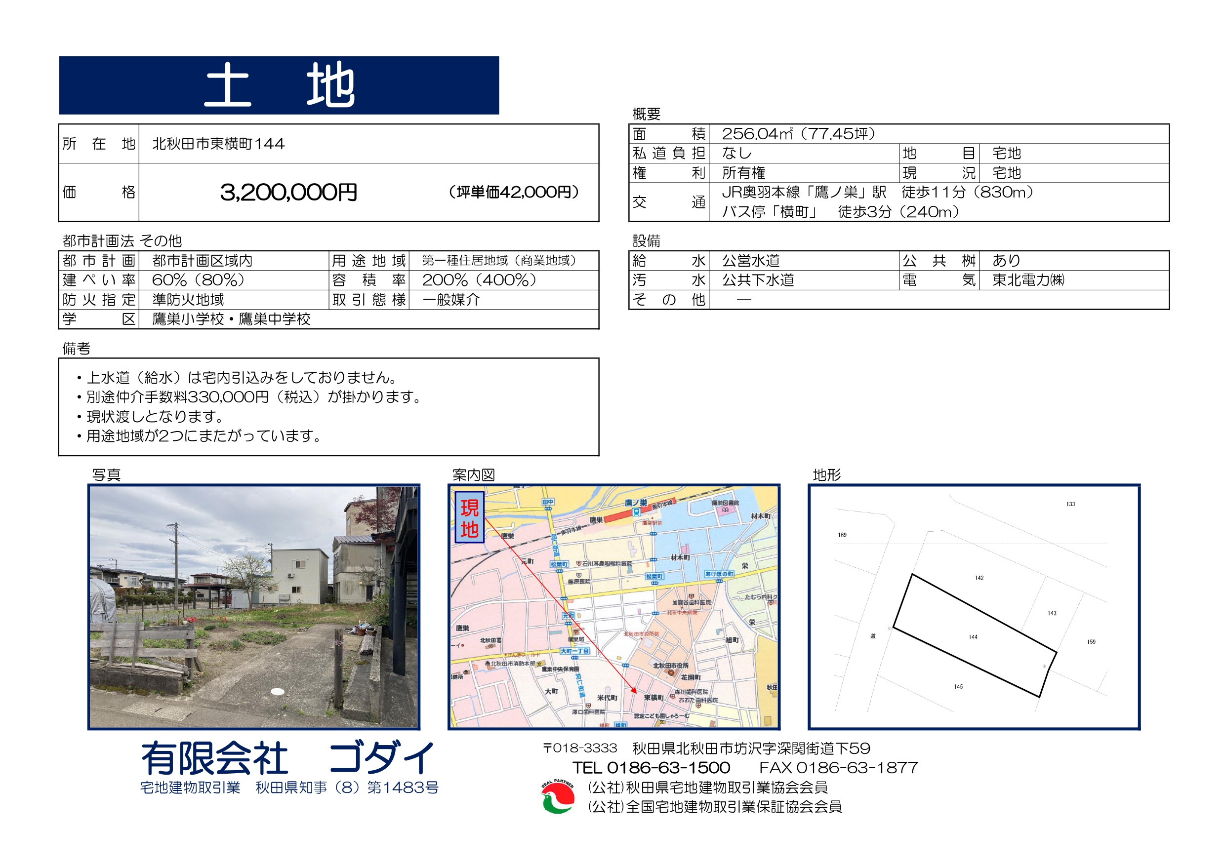 土地 北秋田市東横町 | 北秋田市の不動産はゴダイへ